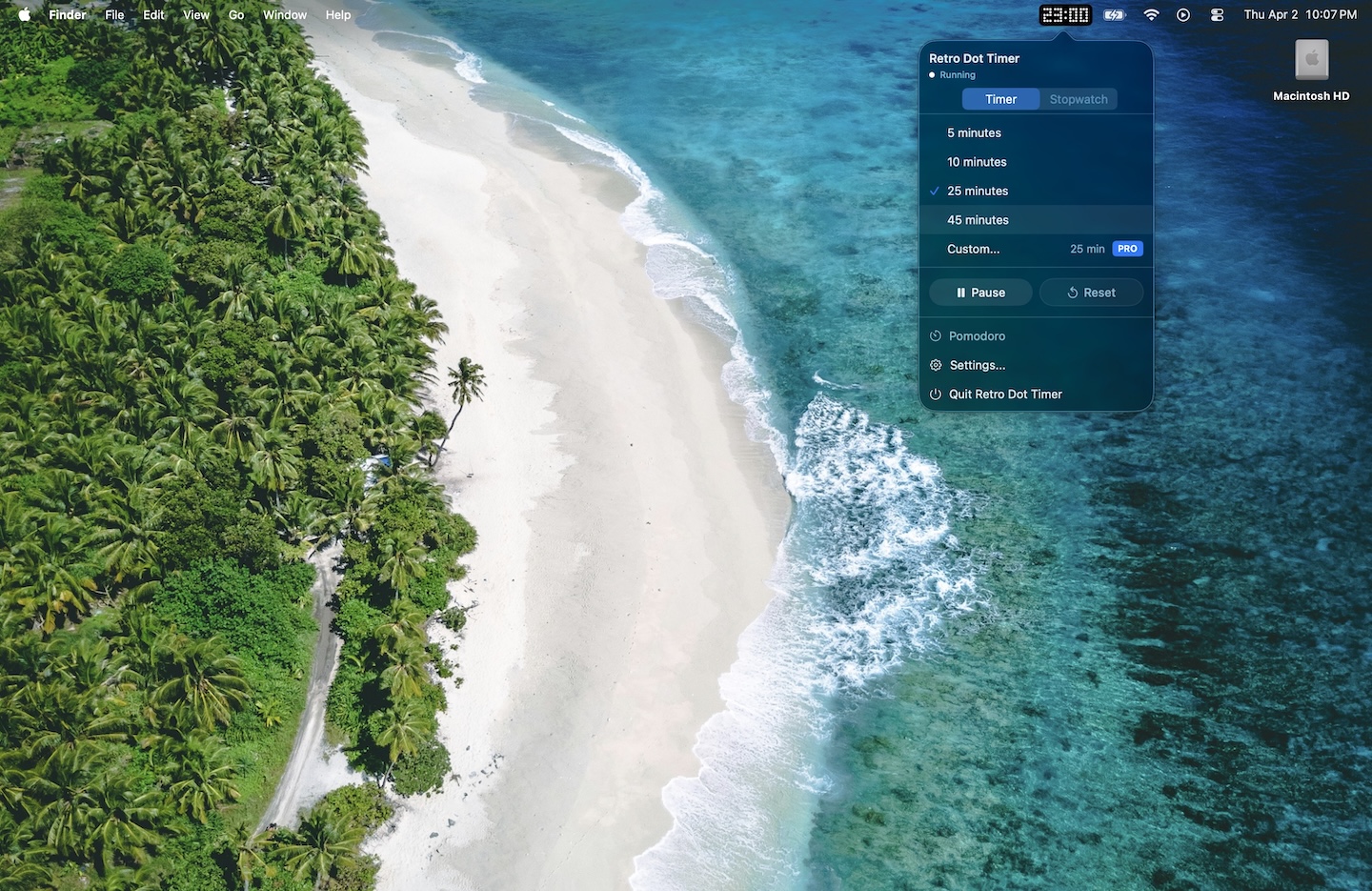 Retro Dot Timer (free) puts a retro dot-matrix countdown directly in the menu bar. The timer displays as a dot-matrix readout — think old scoreboards or airport departure boards. It's visually distinctive and easy to read at a glance. It includes preset durations, a built-in Pomodoro mode, and a one-time $4.99 Pro upgrade for custom durations and additional display styles.